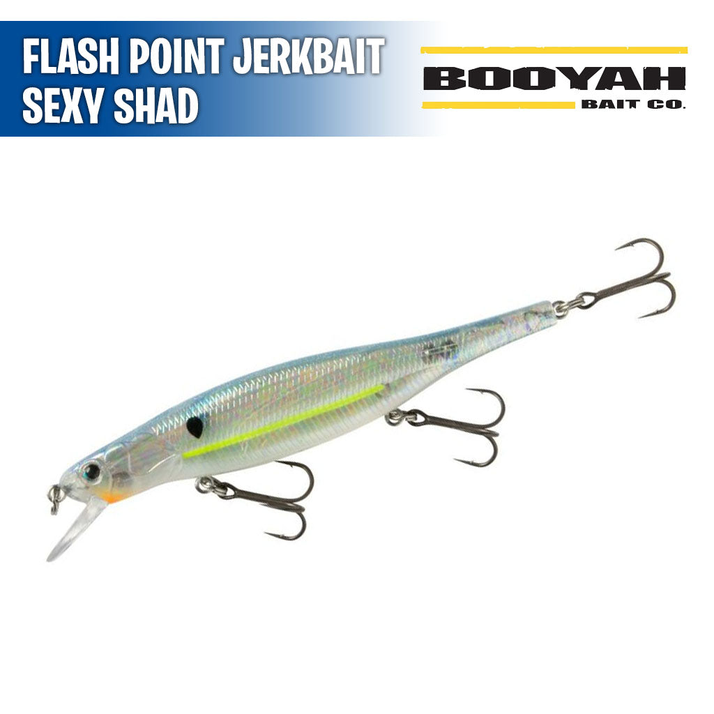 Al producir un reflejo único en la parte superior del señuelo, el Flash Point ofrece a los peces una apariencia diferente a la del reflejo lateral habitual de un jerkbait. Fabricado con pesos internos de tungsteno que se transfieren a la cola para un lance a larga distancia sin esfuerzo, el Flash Point destaca por cubrir grandes extensiones de agua cuando se utiliza como un jerkbait tradicional. Con tres anzuelos triples Super Slide de gran precisión, el Booyah Flash Point Jerkbait está listo para pescar desde el primer momento y se sumerge hasta 1,8 metros(6 pies) sin necesidad de ajustes.